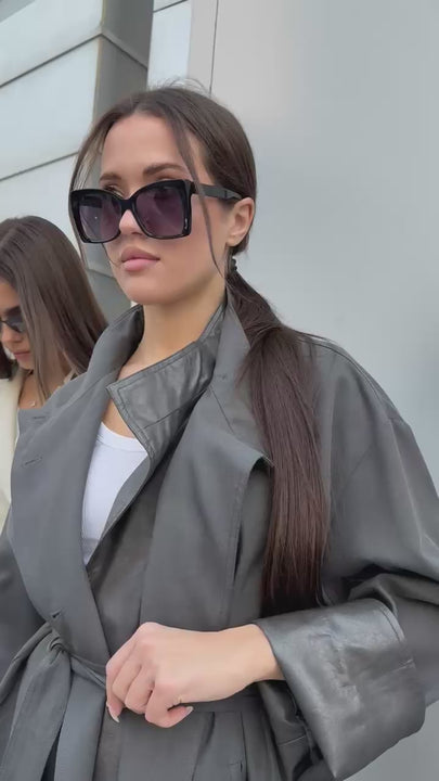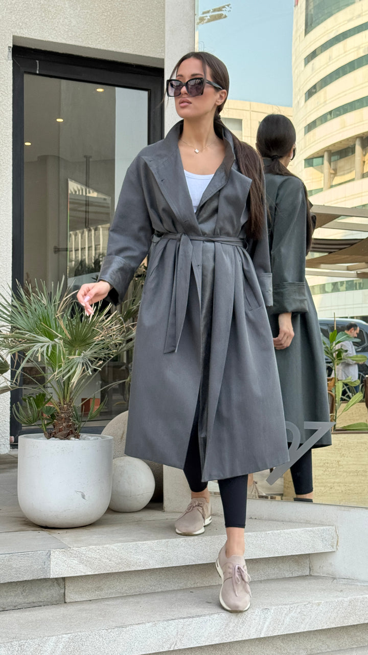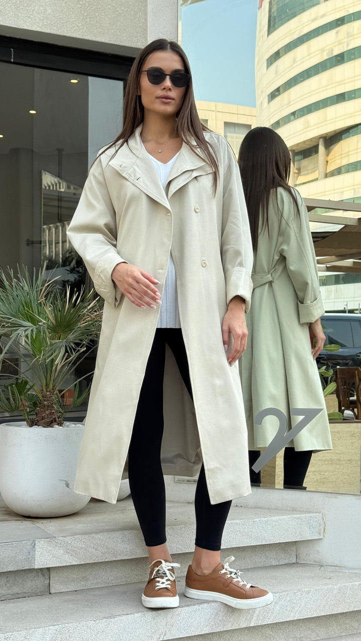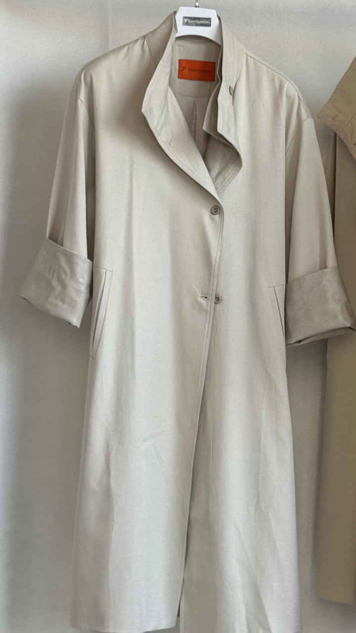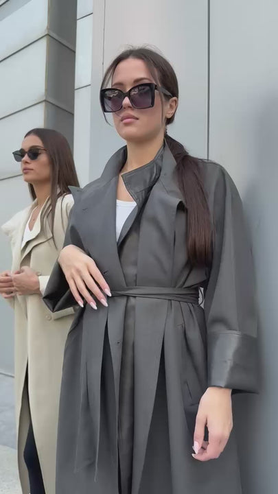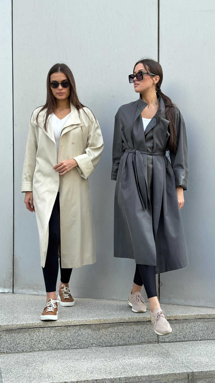 “This long trench coat features a sleek silhouette with a belted waist and a chic leather front panel. Its clean design and modern leather detail make it an elegant yet contemporary piece for everyday style.”