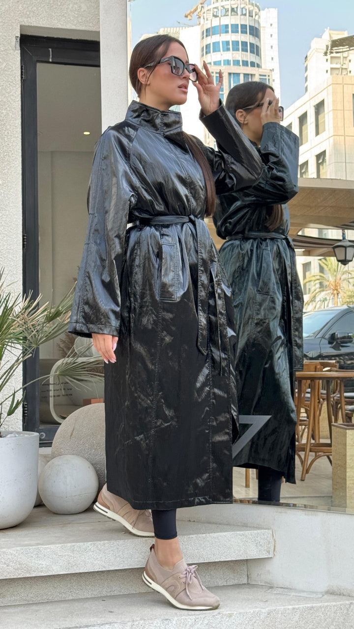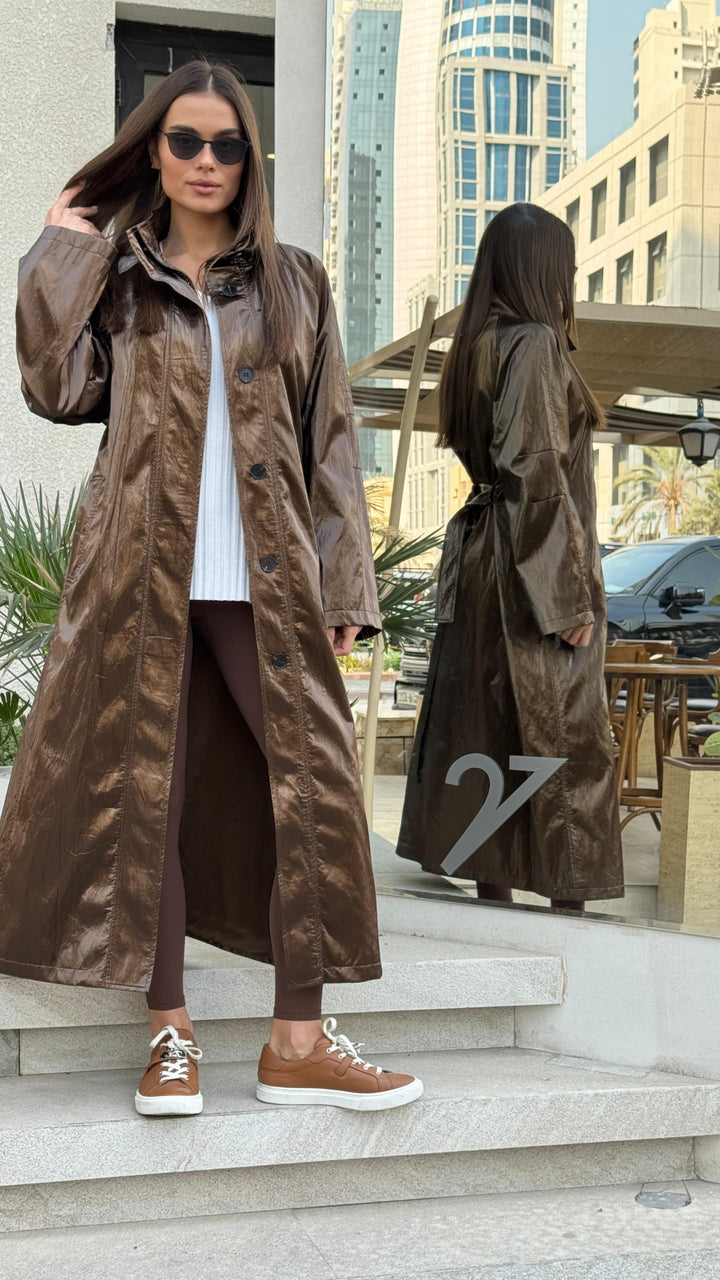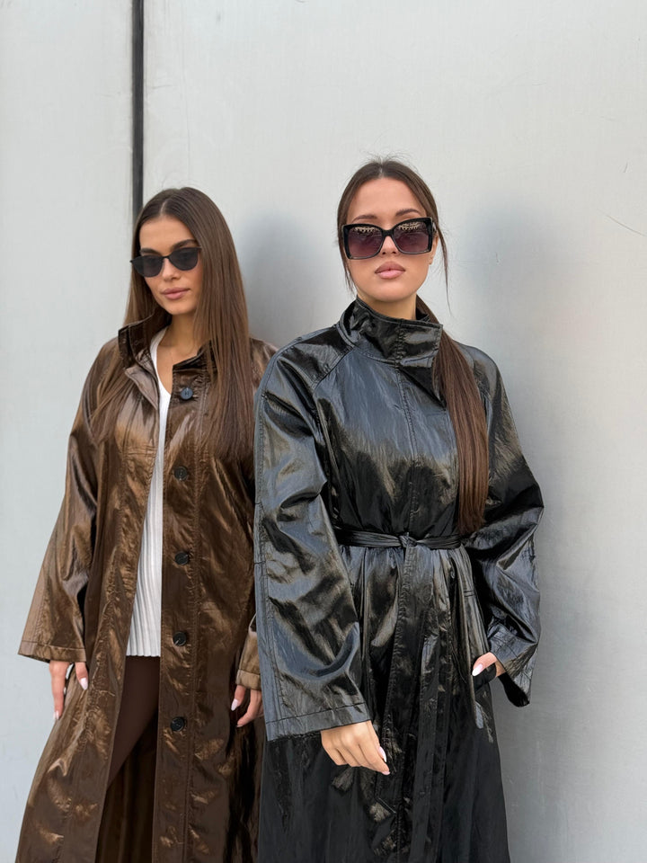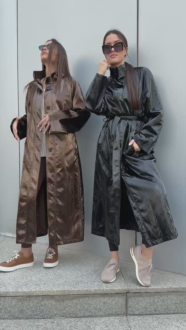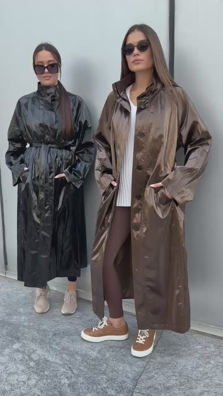 A long, glossy trench coat made from a lightweight, slightly reflective fabric. It features wide sleeves, a high collar, and a clean, minimalist design, with a belted waist that adds structure and a modern, stylish look.
