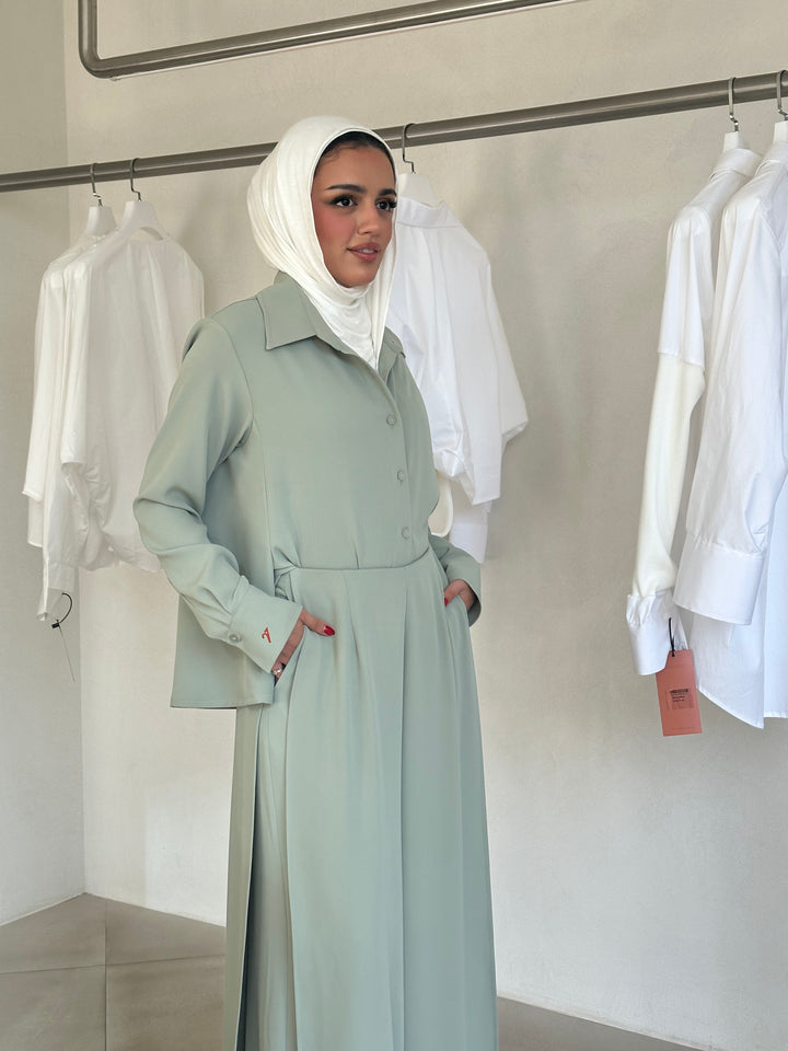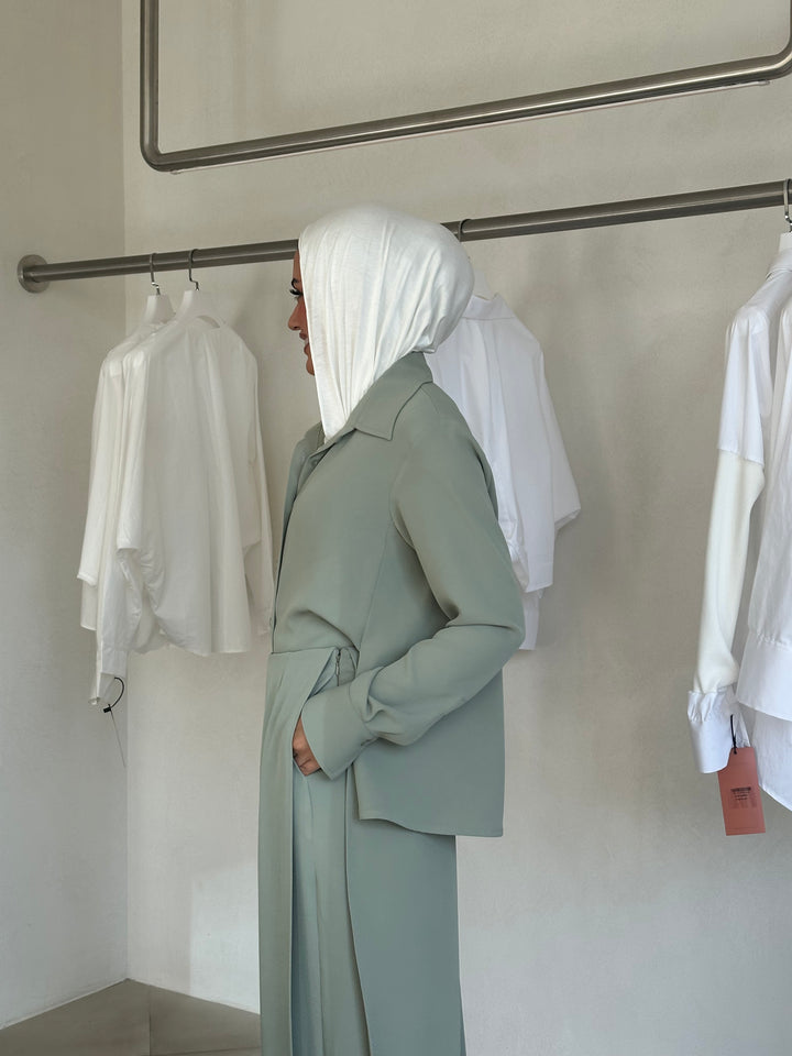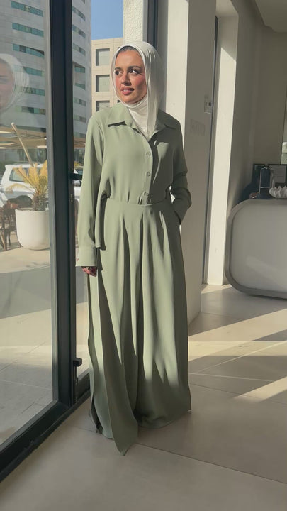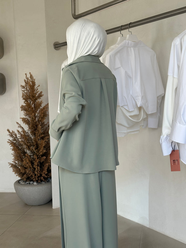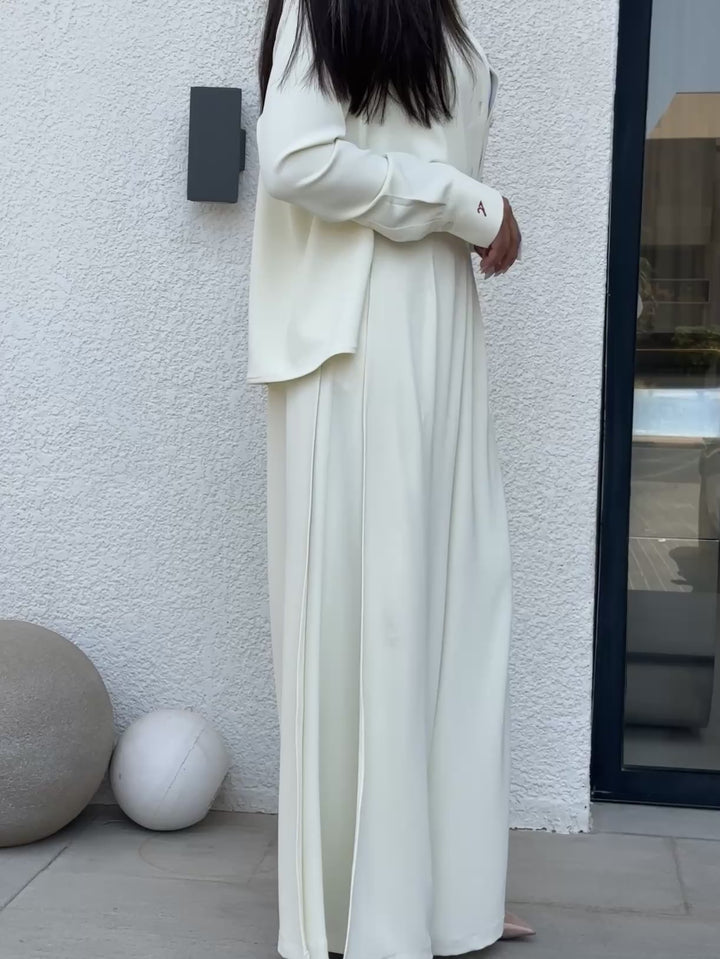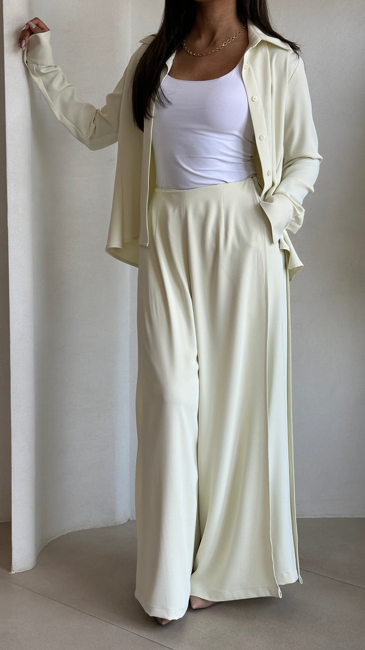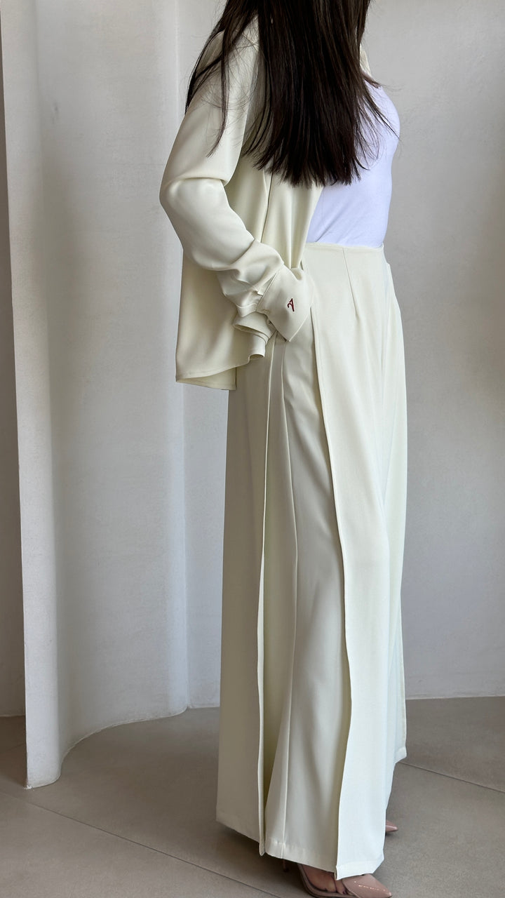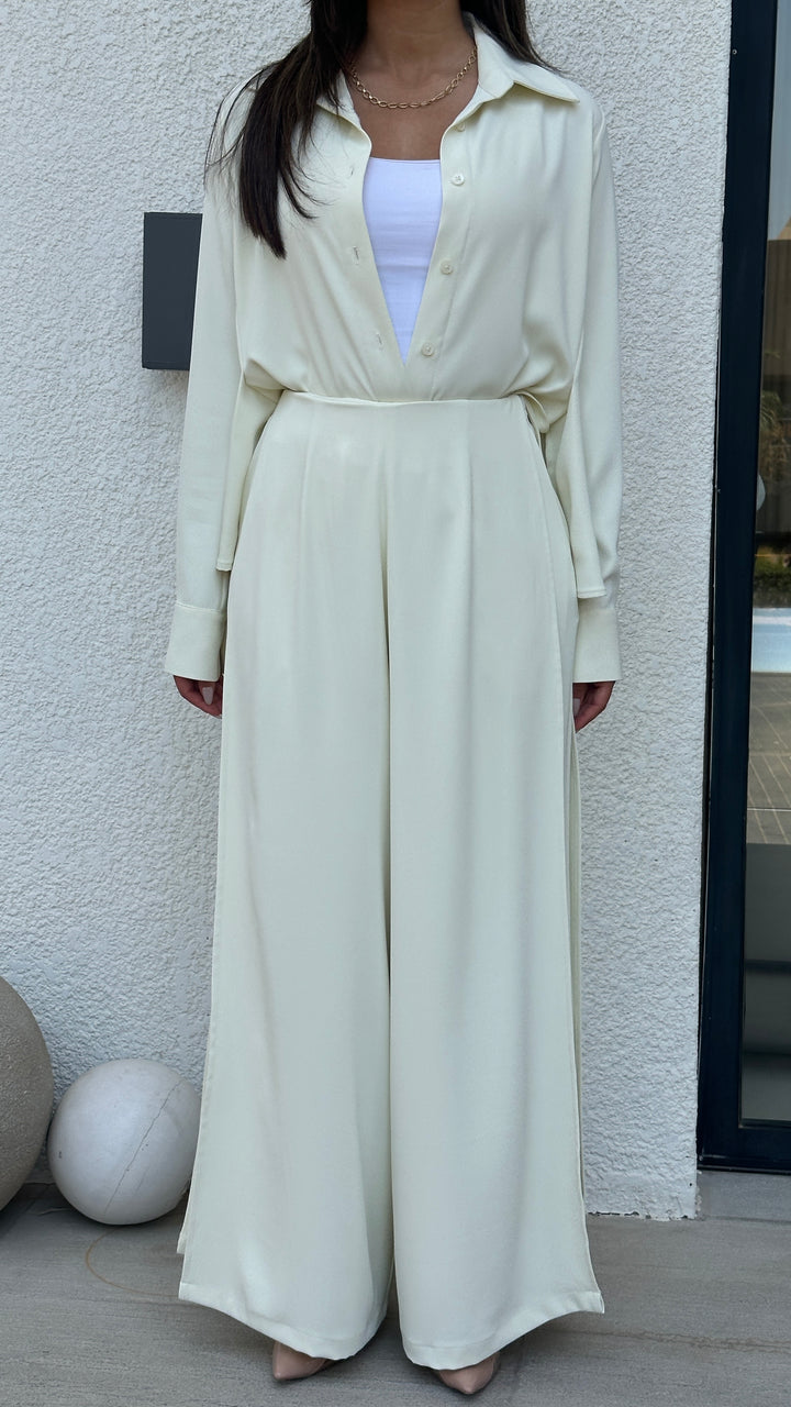 Effortlessly refined, the Aloura Set features wide-leg tailored trousers and a fluid open-front blouse in a buttercream . Designed for both comfort and elegance, its your go-to for elevated everyday dressing.