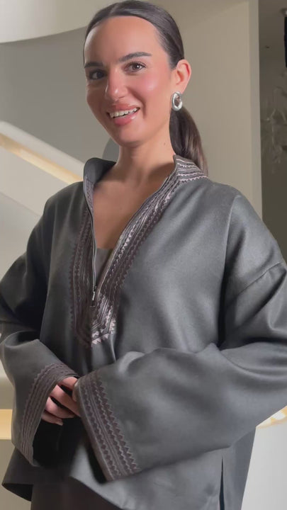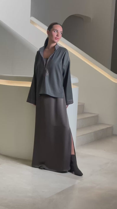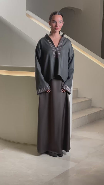 Hand-embroidered cotton kashmir crop top with leather details, paired with a silk dress featuring an adjustable zipper slit.
