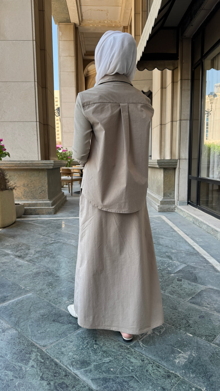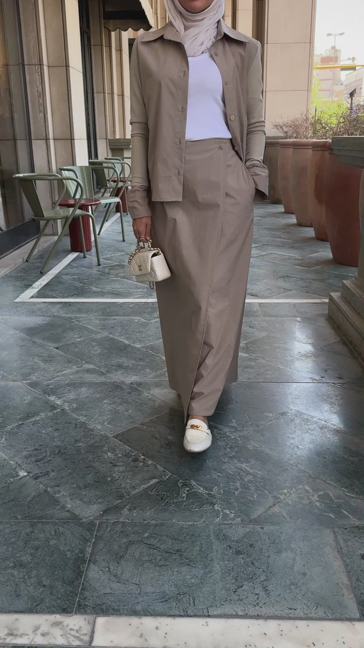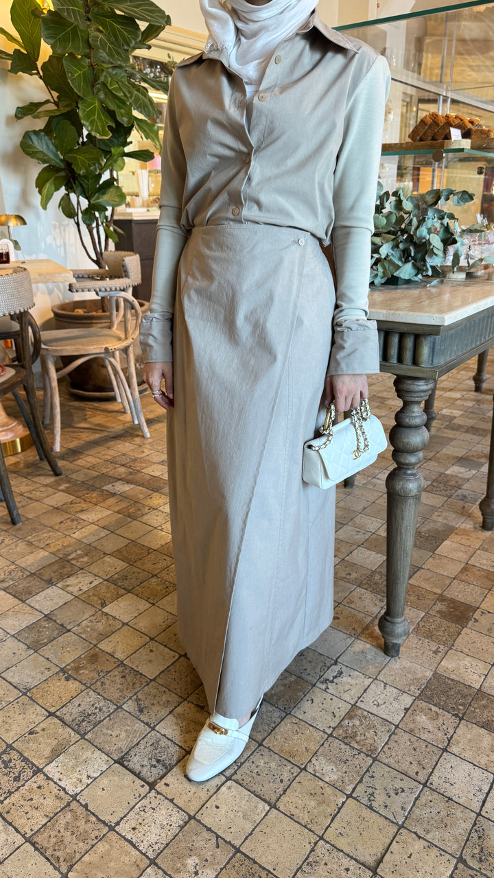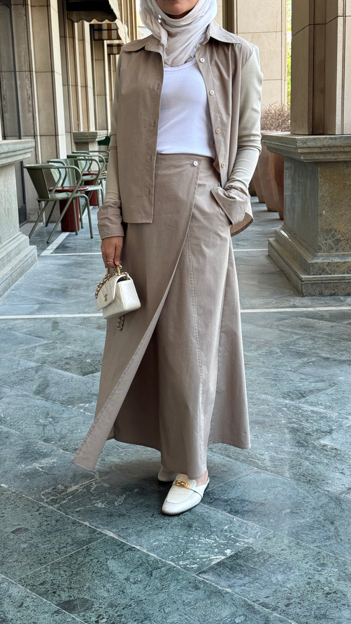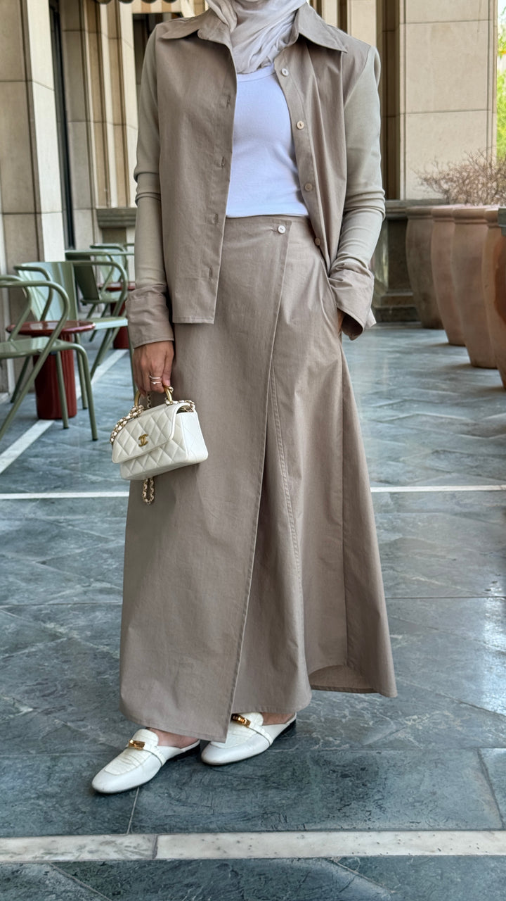 A beige co-ord set featuring a high-waisted flowy maxi skirt with a soft wrap-like detail, paired with a loose-fit button-down shirt in the same shade. The monochrome design gives it a clean, minimal, and effortlessly elegant look
