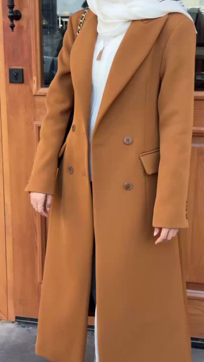 Elegant long jacket made from high-quality fabric, featuring a tailored straight fit and classic wide lapel collar. Designed with a double-breasted button front and practical front pockets for a refined, timeless look.