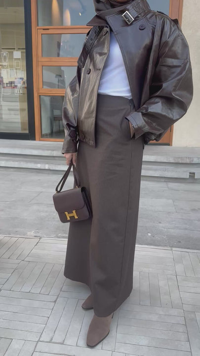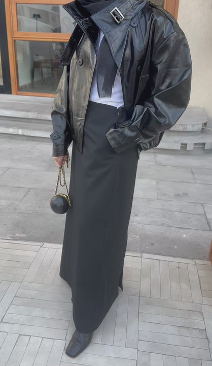 Leather jacket in one size, paired with a maxi skirt in multiple sizes made from lightweight cotton-cashmere fabric The skirt features a zipper for adjustable slit contro.