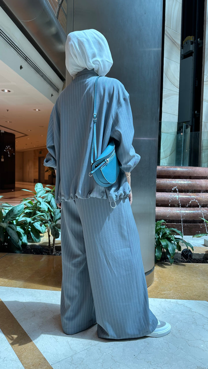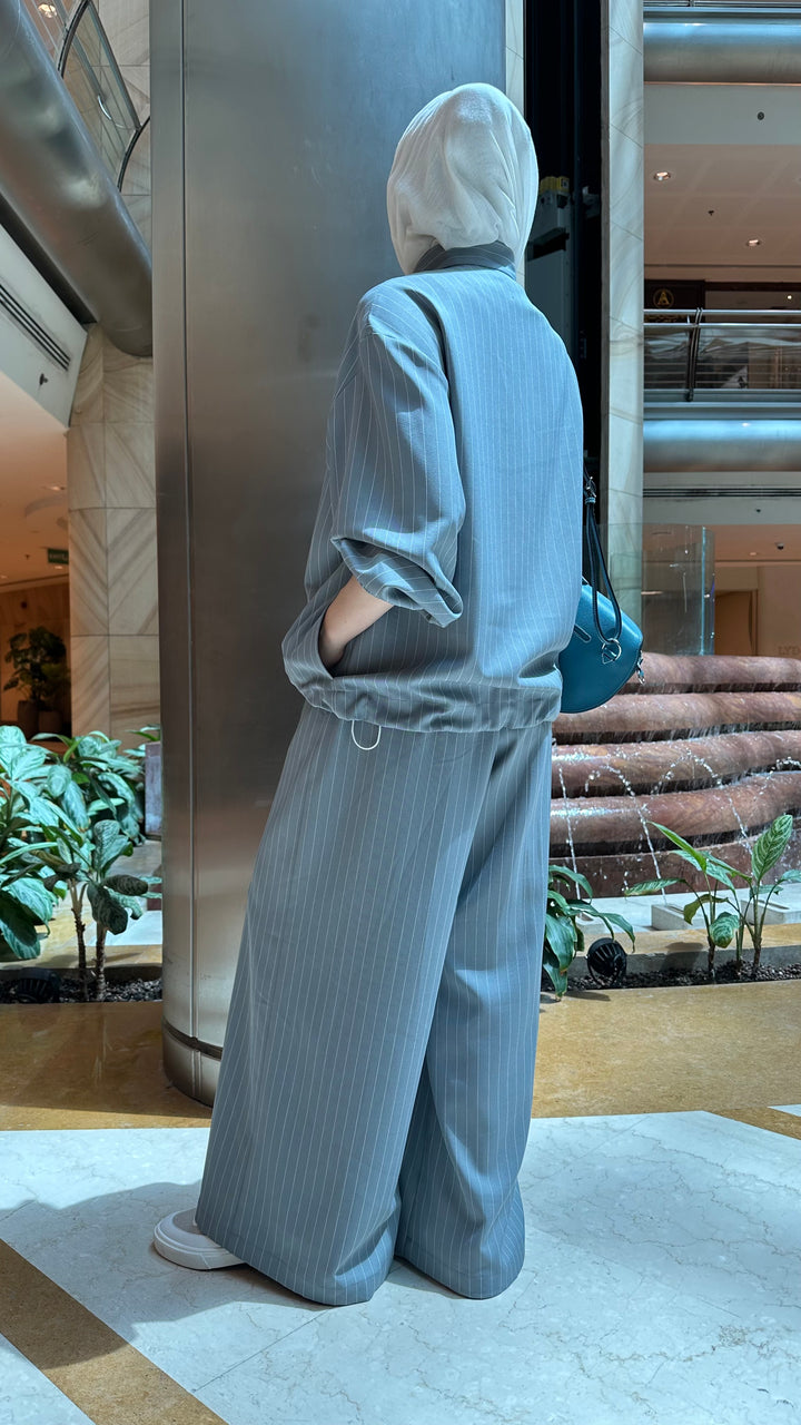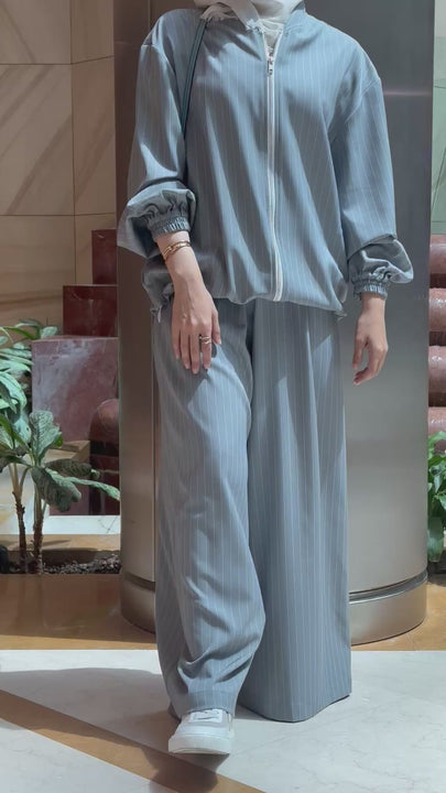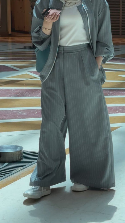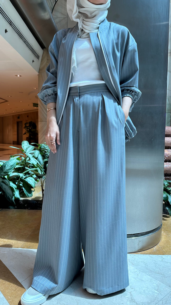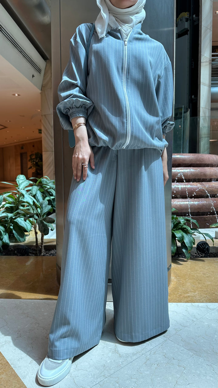 A pinstriped two-piece set featuring a relaxed zip-up jacket with elasticated cuffs, paired with high-waisted wide-leg trousers in the same flowy fabric.