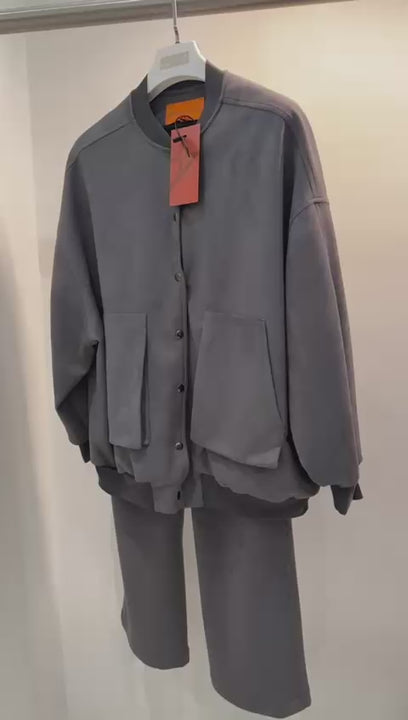 A modern suede set featuring an oversized button-up jacket with large pockets and straight-cut pants. Soft, luxurious texture for a refined yet comfortable look.