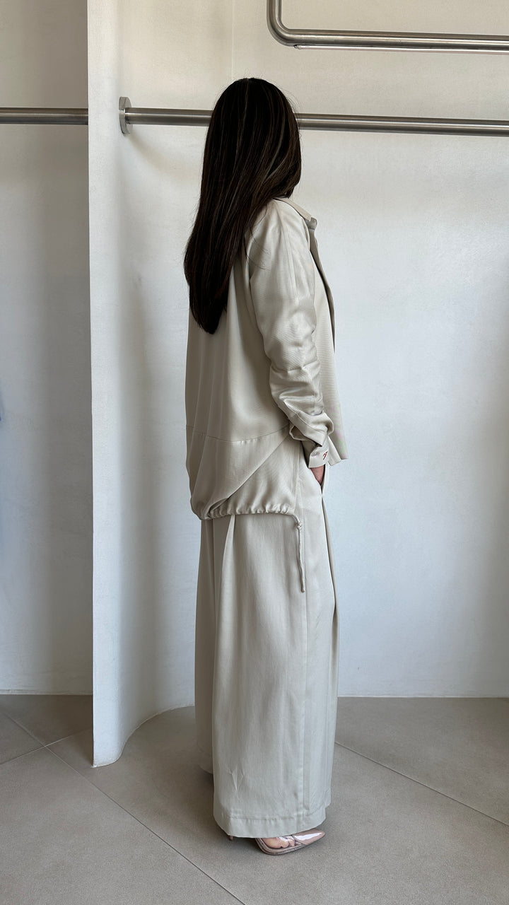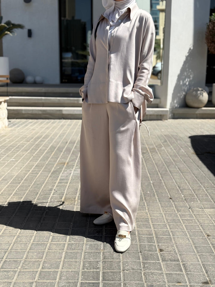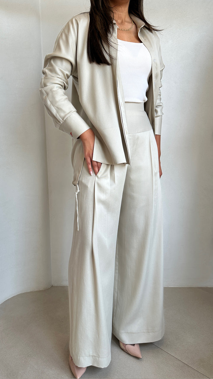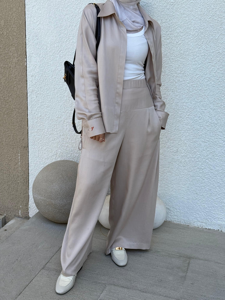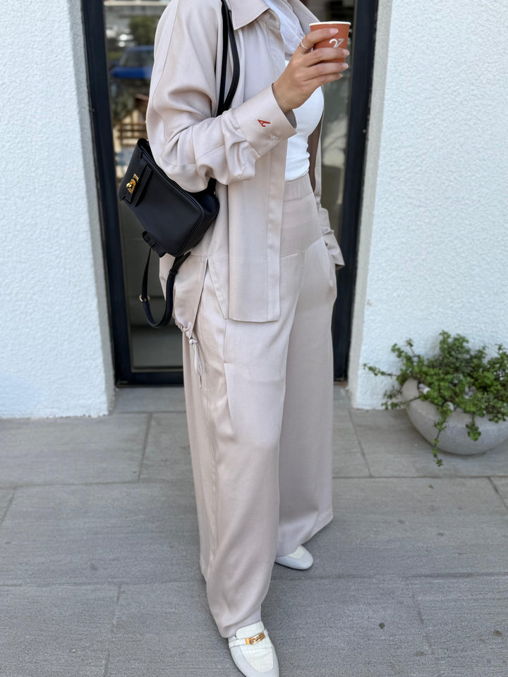 A light beige satin cotton shirt, worn open for a relaxed, elegant vibe Matching high-waisted wide-leg trousers made from a flowy, soft fabric that adds a graceful silhouette.
