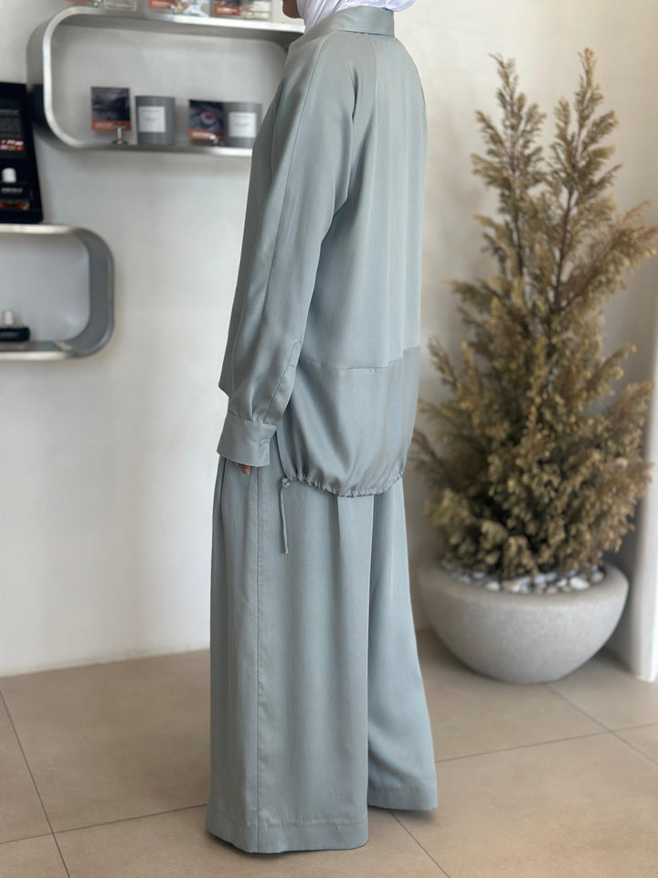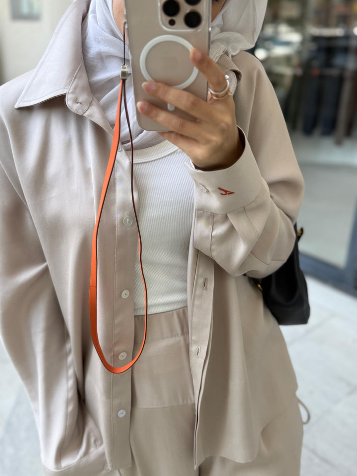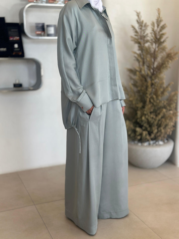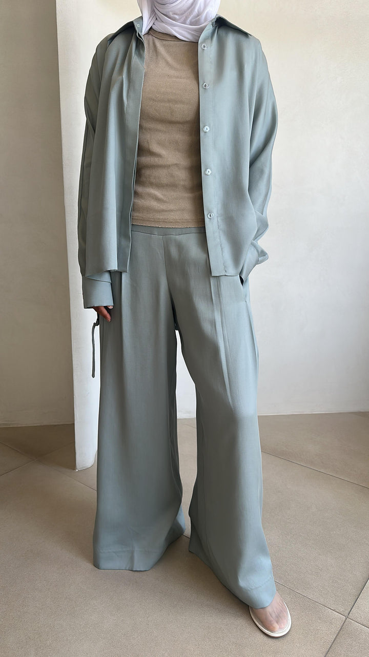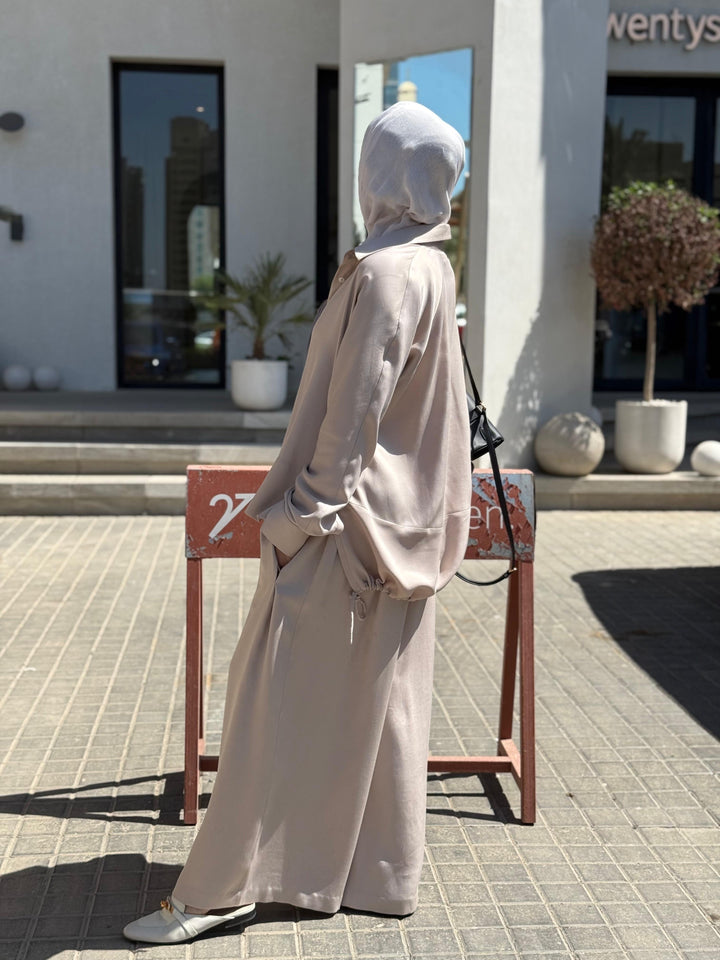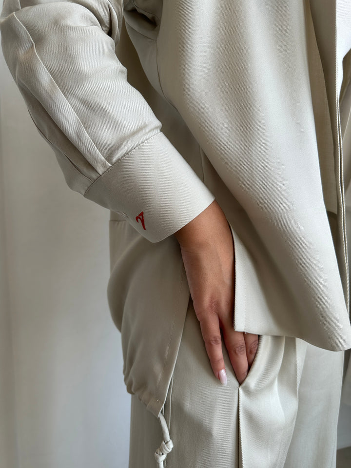 A light beige satin cotton shirt, worn open for a relaxed, elegant vibe Matching high-waisted wide-leg trousers made from a flowy, soft fabric that adds a graceful silhouette.
