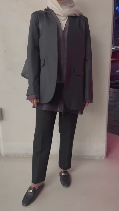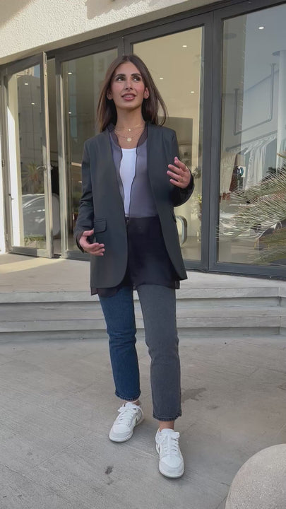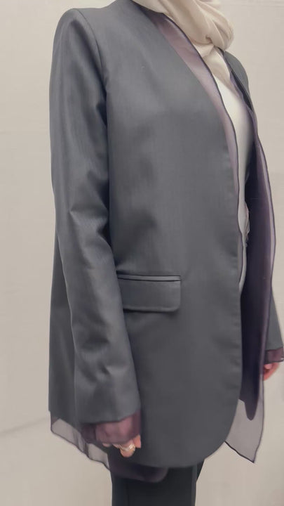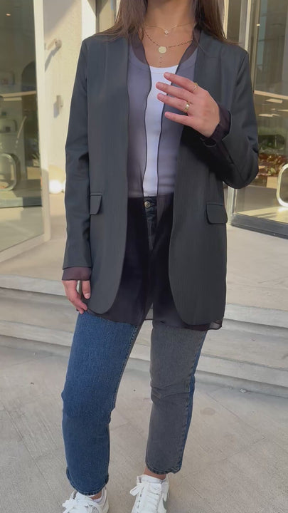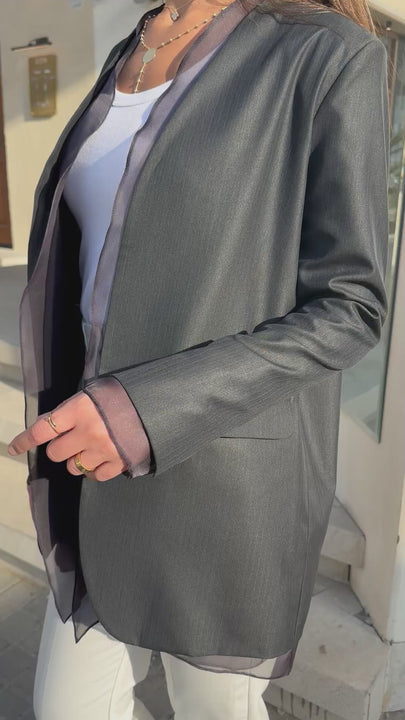 A tailored, charcoal gray blazer with a fine pinstripe pattern. It has a sleek, open-front design (no buttons) and flap pockets on each side. The cut is straight and slightly elongated, giving it a formal yet contemporary appeal. The look is complemented with touches of organza fabric, adding a subtle sense of softness and elegance to the structured design.