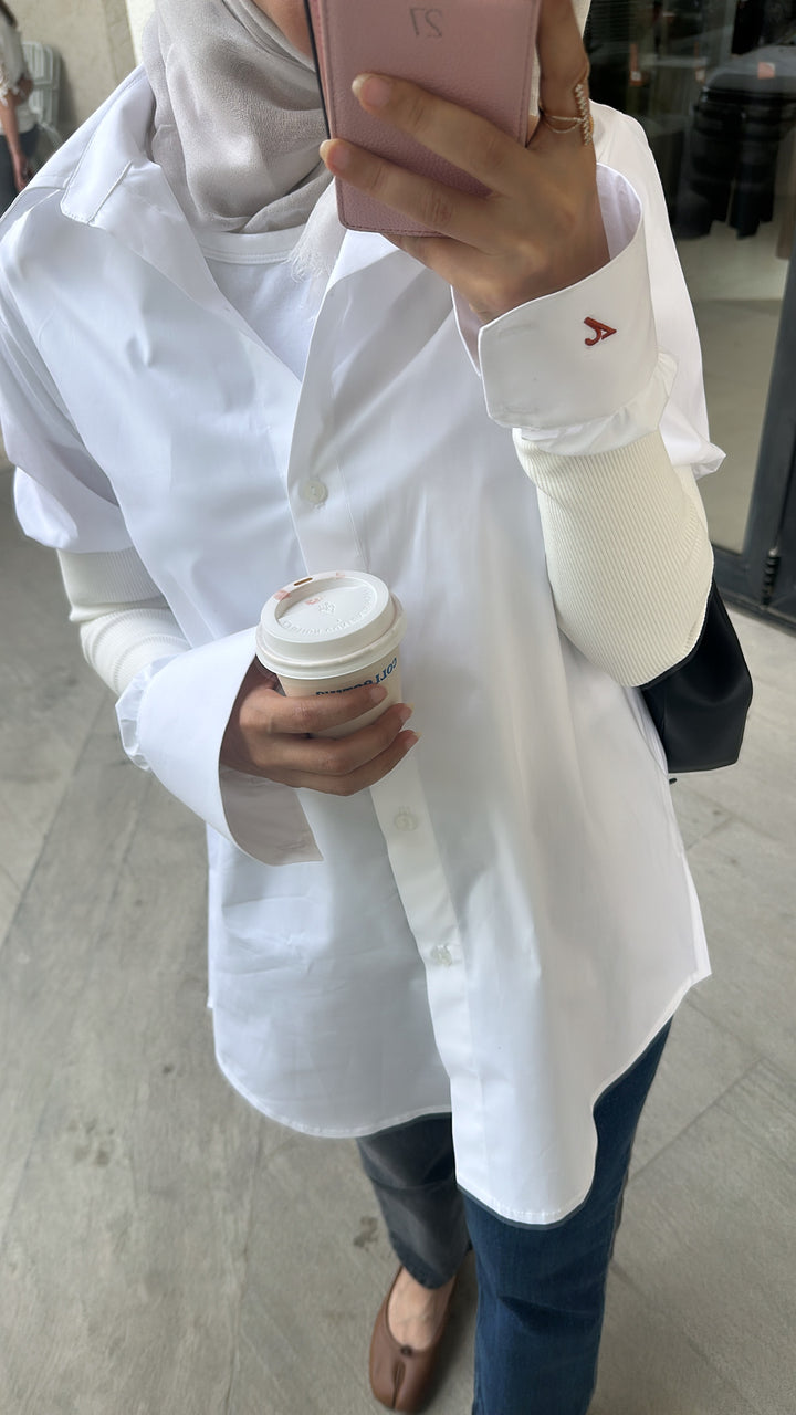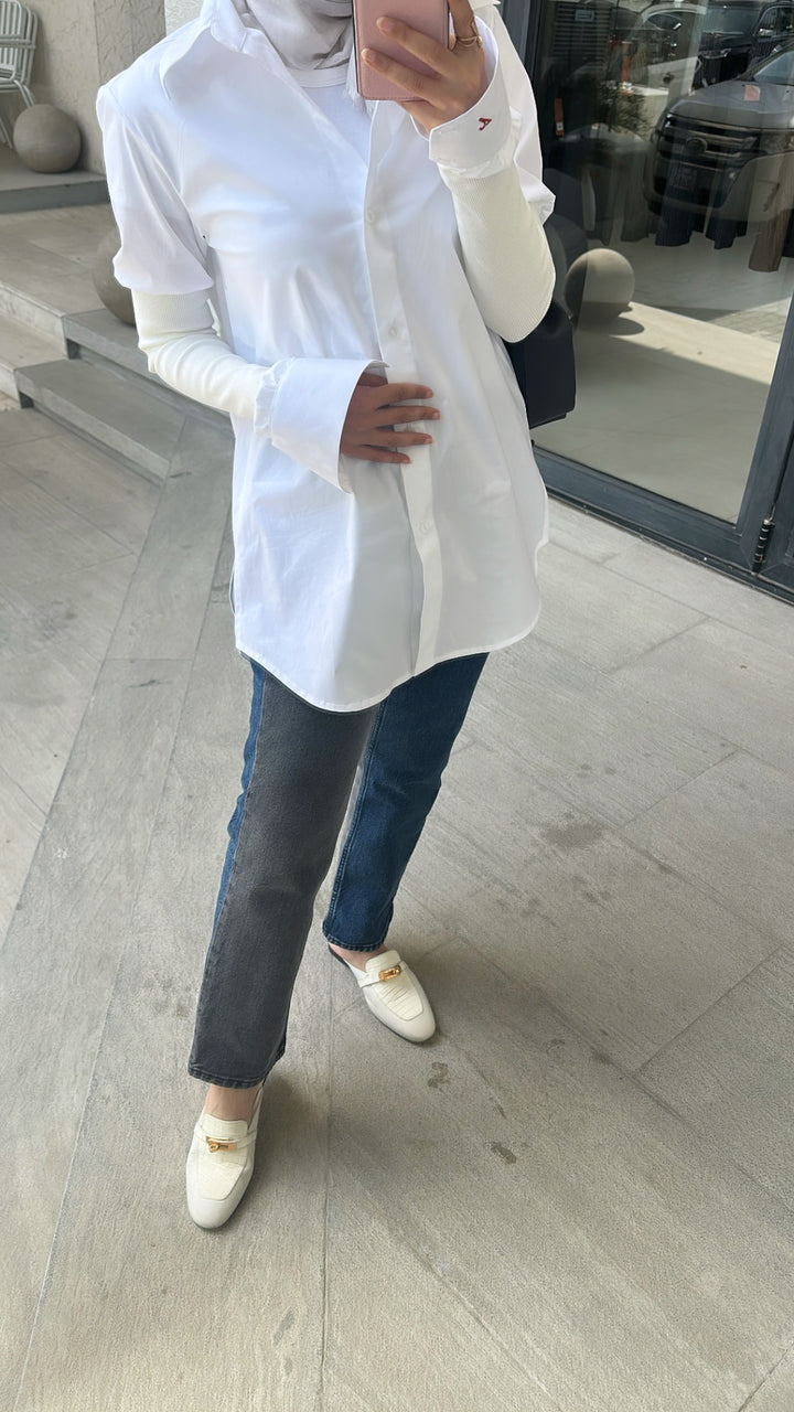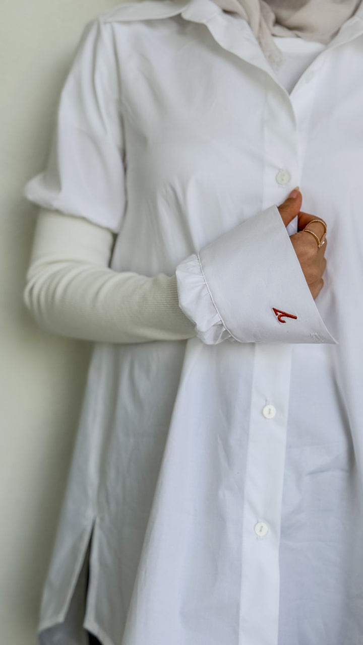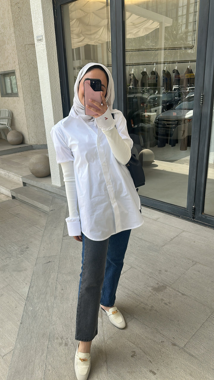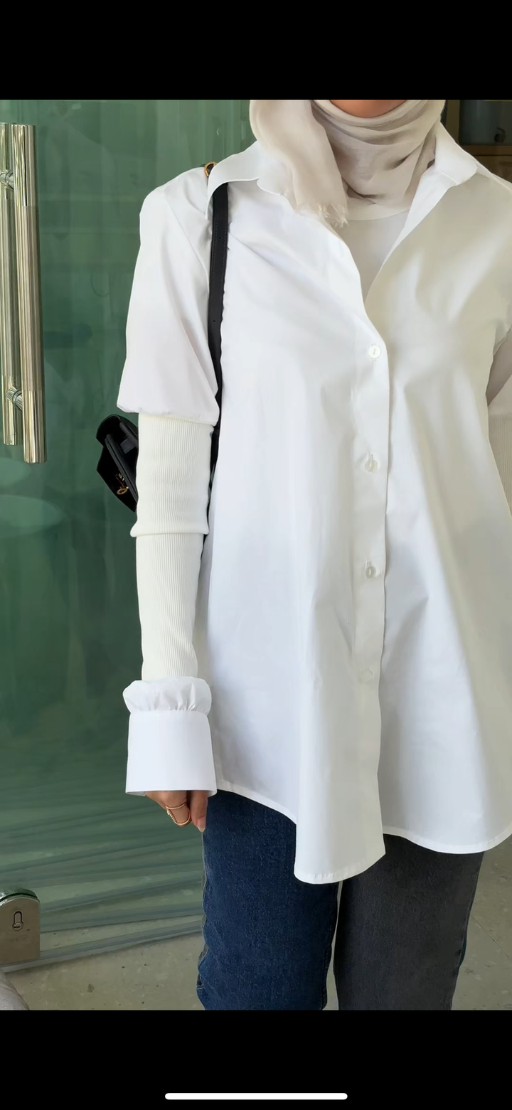 “White Aura” radiates understated elegance. Crafted from breathable cotton, this white shirt features a relaxed silhouette with flared sides, elevated by ribbed outer sleeves that add texture and a layered effect. A refined everyday piece that blends comfort, modesty, and effortless style.